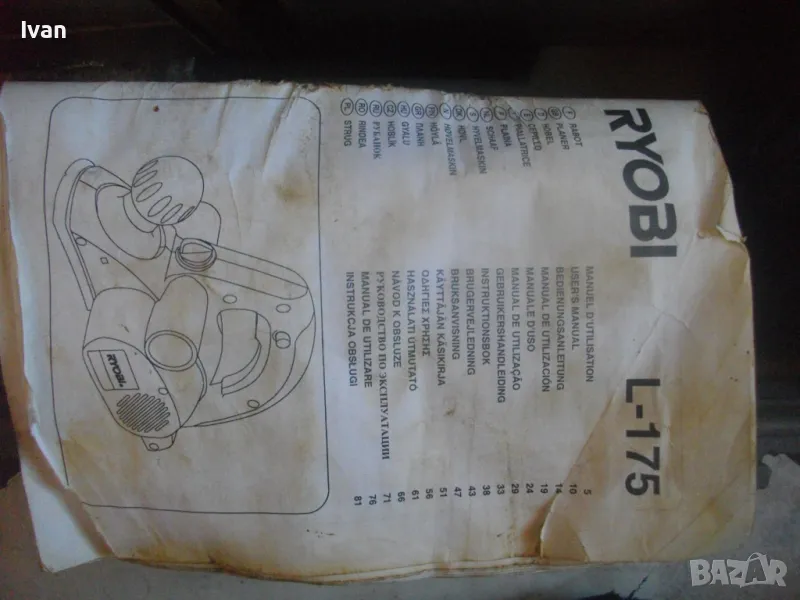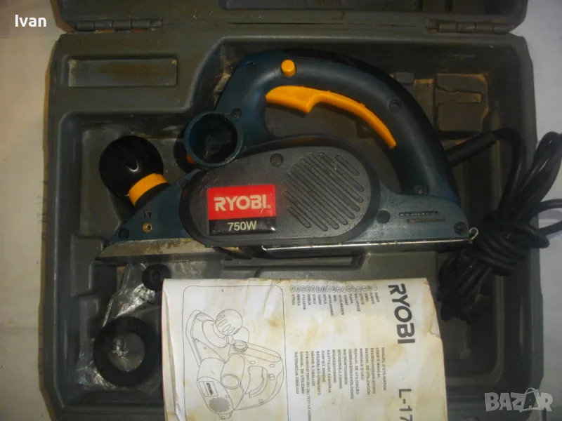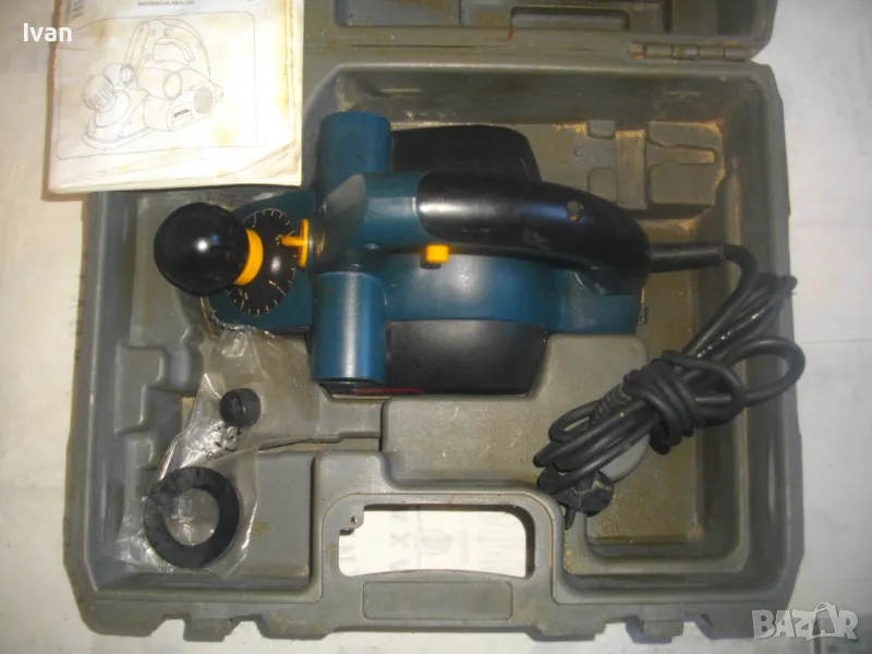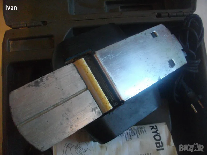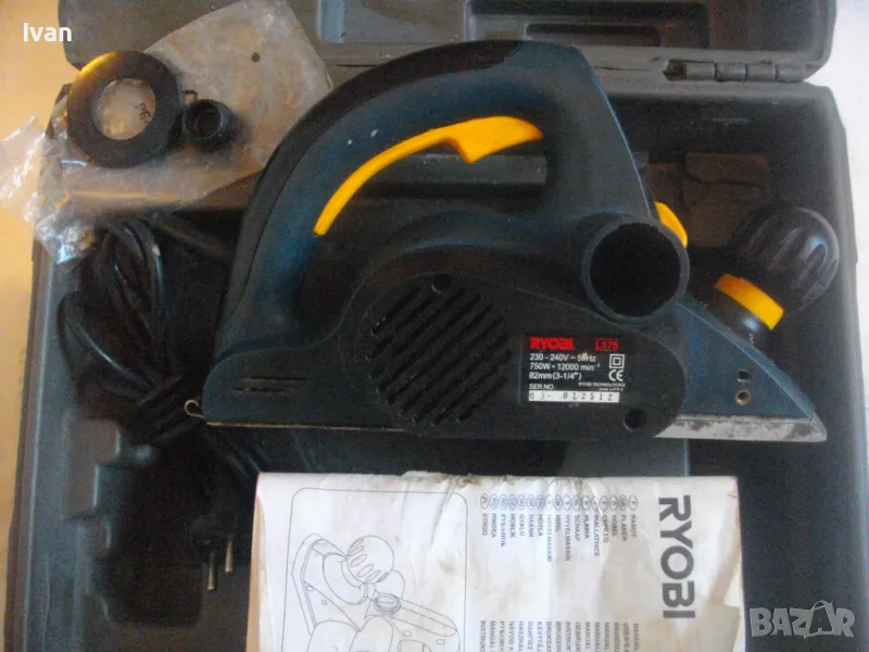 ОПИСАНИЕ на електрическо ренде машина хобел. Предлага се за части само цяла/не се вадят части от машината или за ремонт - някой да си я оправи. Марка и модел - RYOBI L175. Производство - Made in P.R.C. Производител - Ryobi Technoloures. Запазен външен вид и техн.състояние - не тръгва. Проблема не мога да установя. Мощност на мотора 750 вата, скорост 12 000 об/мин. стружуване 0-2 мм, конектор отпадъчна прах двустранен външен вграден. Ножове поставени 2 бр. размер 82 мм, ремък оригинален на машината, отлично състояние ножове, ремък и върток стружуване, без наранявания. Автозащита на спусъка. Алуминиев голям долен плот. Оригинален куфар на машината с вложка и фабричното лого. Книжка указания оригинална и оригинална гумена мембрана. Тегло само на машината - 3,6 кг. Тегло машина с куфар - 6,0 кг. Без коментар е цената. Не се вадят части отделни от машината.