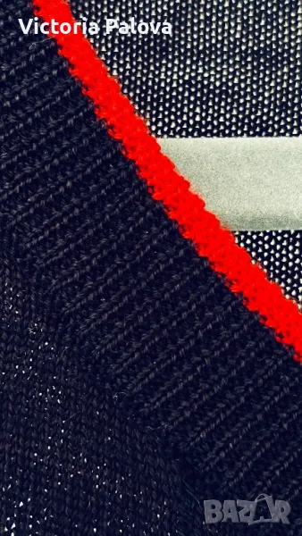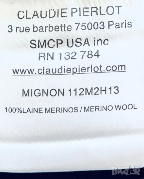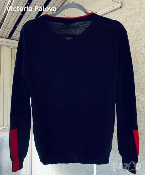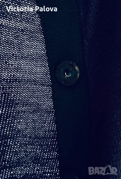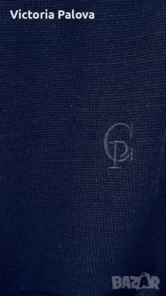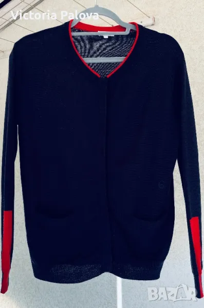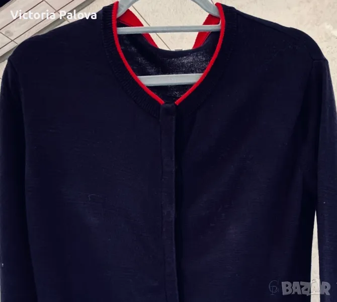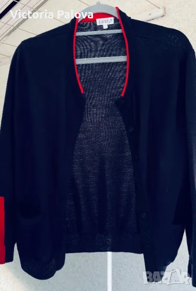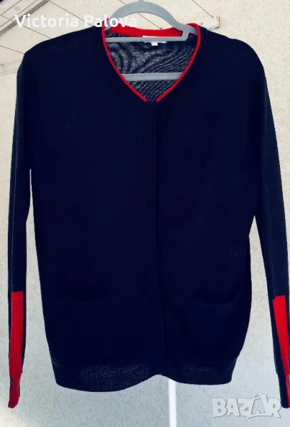 Скъпа жилетка с копчета магнит- тик-так, избродирано лого, тъмносин цвят, може да се носи на голо тяло като алтернатива на риза, материята позволява това - изключително мек и гладък меринос, усеща се като коприна. Брандът е бил създаден “за жените от Париж” 1984г и до днес не е изгубил популярността си поради качество си на мериноса. Рамо - 46см, ГО - 52см, дължина - 64см, ръкав - 59см.