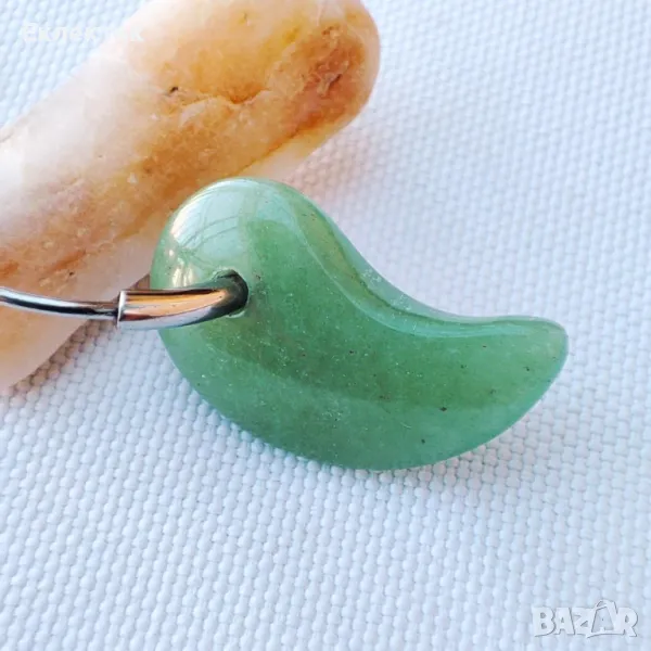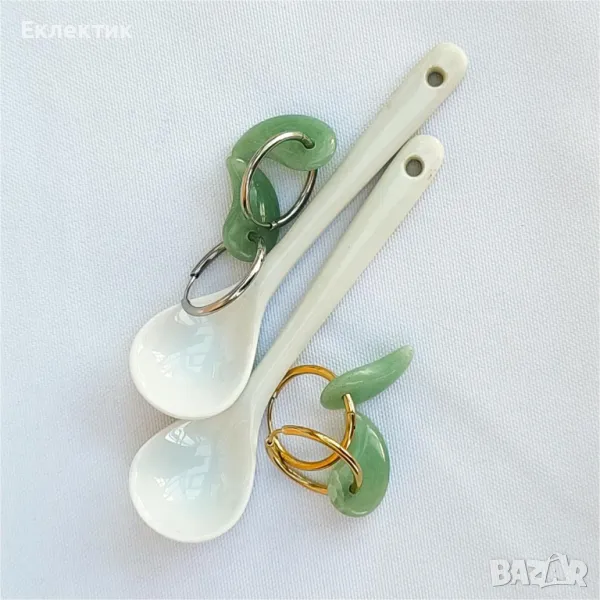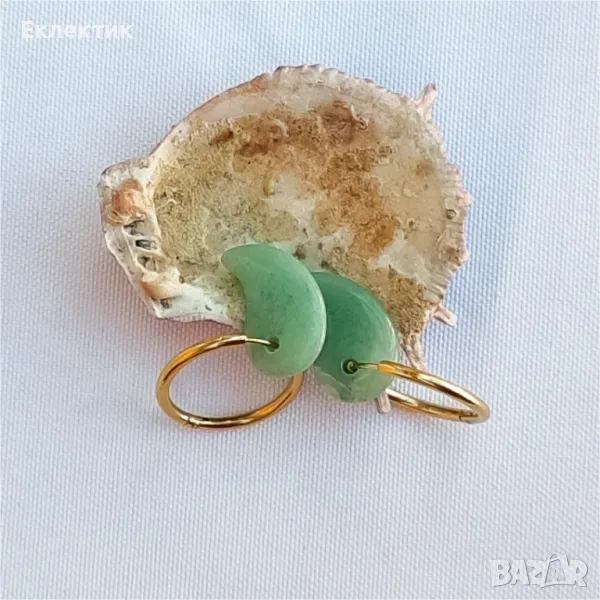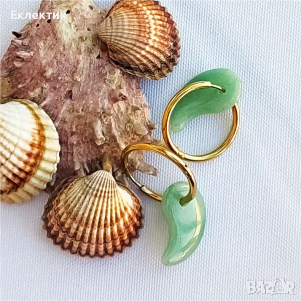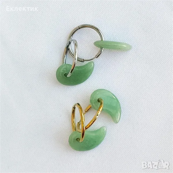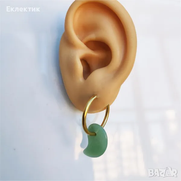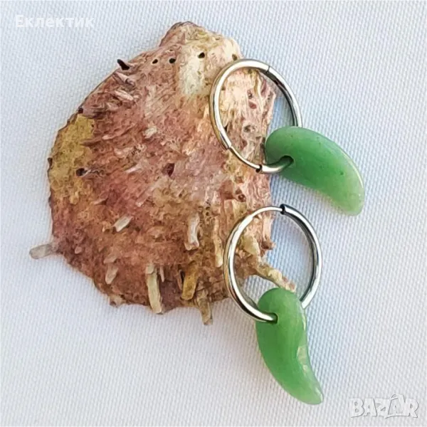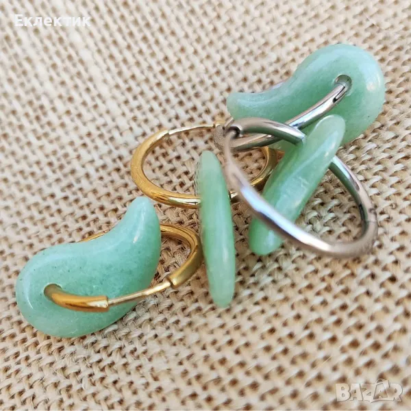 Магатамите са изваяни от естествен неоцветен зелен авантюрин и са с размери 22~23 x 14 x 4~5 mm. Обеците тип Хъги са хипоалергенна 316L неръждаема стомана в златисти и стоманени вариации (18 mm външен диаметър). Всяка обеца тежи 3,5 gr.
