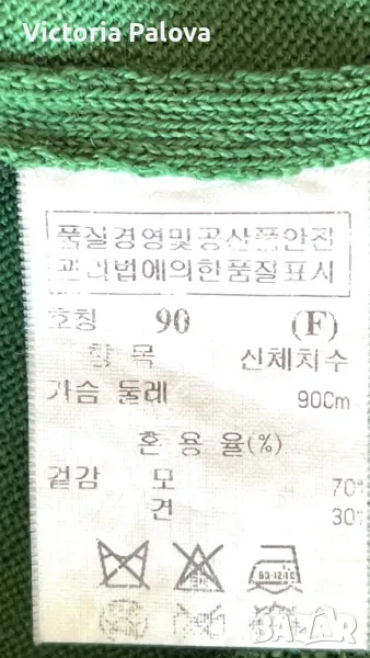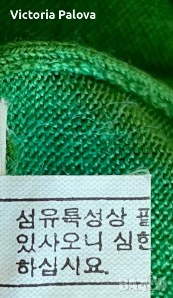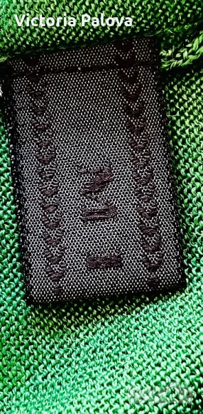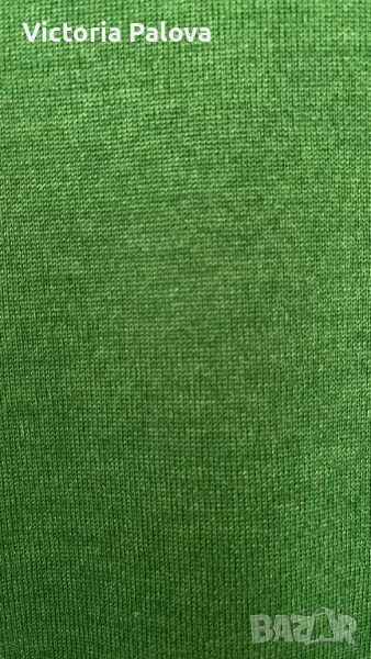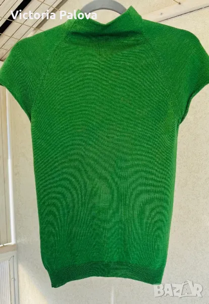 Рядко срещана марка, невероятно качество материя - 70% коприна , 30% меринос, разтеглива.Цветът е пролетна трева, моделът е също интересен - няма шев по яката, реглан. ГО - 40см, дължина - 62см.