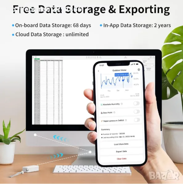 - Поддържа експортиране на данни: Насладете се на до 68 дни вградено съхранение на данни, до 2 години съхранение на данни в приложението и неограничено съхранение в облак. Използвайки нашите актуализирани диаграми с цветни данни, можете ясно да видите температурата и влажността на година, месец, ден или по час. Данните могат да бъдат експортирани като .csv файл за по-задълбочен анализ на вашата среда. Поддържа множество методи за калибриране на данни.