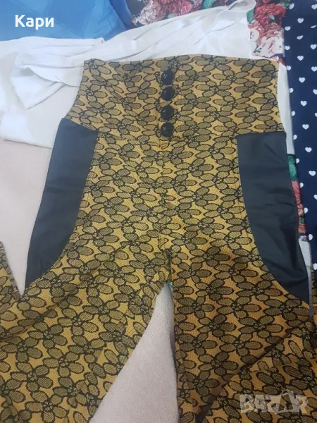 от клинчетата единия черен и синия със сърцата са нови,другия черен е носен няколко пъти е леко по-голям от другите,жълтия е със висока талия с копчета и черна кожа отстрани.