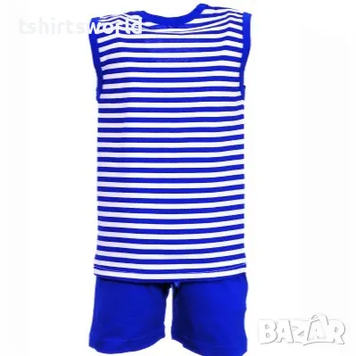 Страхотно ново класическо детско моряшко комплектче от две части на синьо и бяло райе: с блузка без ръкав и трансферен печат Попай Моряка - Bulgaria и къси панталонки. Произведено е в България от 100% висококачествен памучен плат, което не позволява да се измачка, а тънката материя придава комфорт и удобство на вашето дете. Подходящо за носене в горещите летни дни както в ежедневни условия, така и за тематични събития.