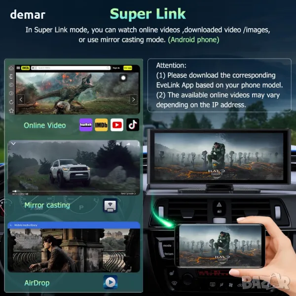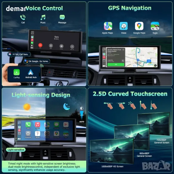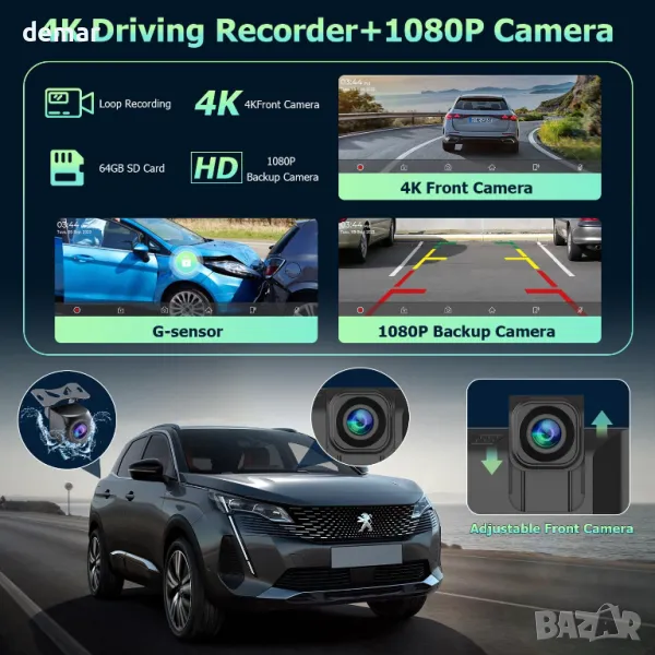 CarPlay екран и регулируема 4K предна камера за зашеметяващо заснемане на видео. Безпроблемно предавайте поточно видеоклипове и отразявайте вашето устройство безжично, поддържано от интуитивна настройка на приложение. Насладете се на разговори със свободни ръце, навигация и музика с Apple CarPlay и Android Auto, включващи гласово управление и превъзходен звук чрез двоен Bluetooth, AUX, FM или вграден високоговорител. Оборудван с 4K предна и 1080P задна камера с нощно виждане, G-сензор и цикличен запис за цялостно покритие на шофирането, той включва персонализиран екран за зареждане и автоматично активиране на задното виждане за допълнително удобство.