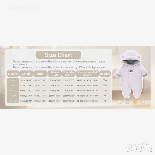 Космонавтът се предлага с ръкавици и буйки за крака (за размерите: 0-3, 3-6 и 6-9 м.) за да поддържат крайниците на бебето топли, докато пълзи.
