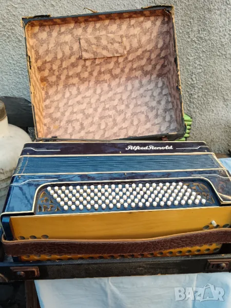 Продавам много стар немски Танго акордеон 120 баса ,,Alfred Arnold" на около 90 години с оригиналната си кутия. Има следи от времето, но е твърде рядък открих само 2 броя на цени от 2000 евро и на горе. Много добър и рядък екземпляр за попълване на колекция.