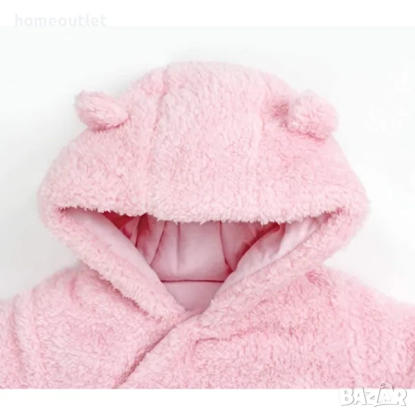 Снабден с качулка и дълги ръкави, предназначен да поддържа главата и ушите на бебето топли и устойчиви на вятър навън.