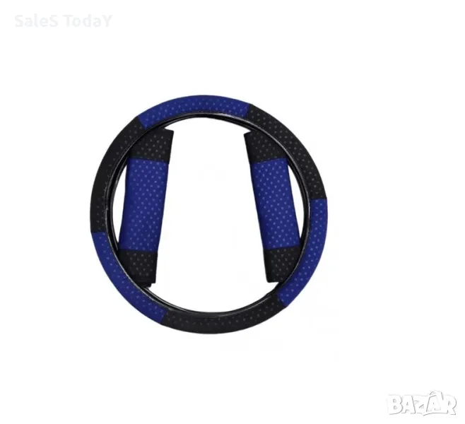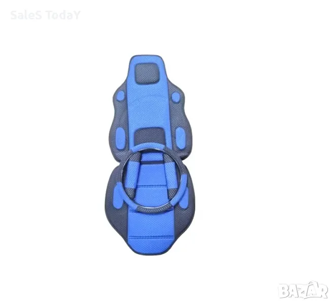 Комплект за автомобил, масажори за седалка, калъф за волан, протектори за колан, 5бр., 3 в 1, син/ черен
