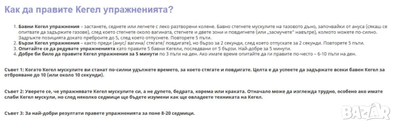 При всяко свиване и отпускане задръжте три секунди, като с всеки изминал ден се старайте да увеличавате времето на задържане. Крайната цел е да задържите мускулите свити десет секунди и още толкова отпуснати.