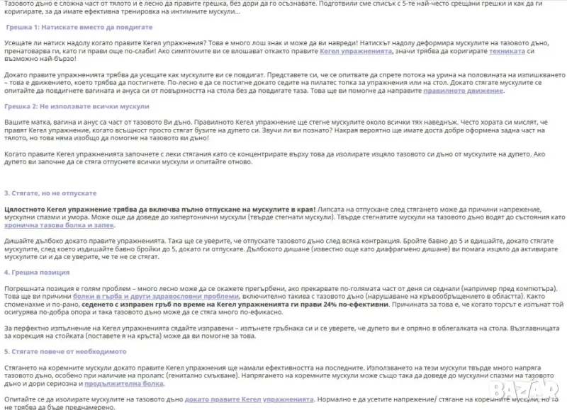 Ако по време или след упражненията усещате болка (където и да е), това означава, че не напрягате правилната група или напрягате и други мускулни групи. При правилно извършване на упражненията не би следвало да изпитвате болка или дискомфорт след това.