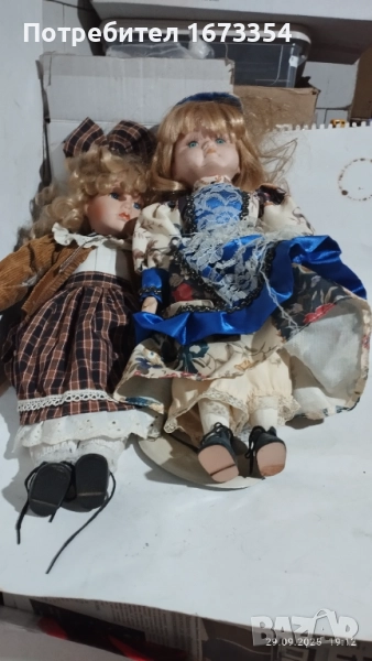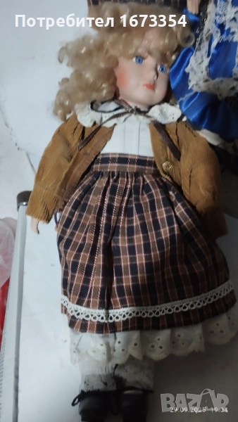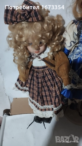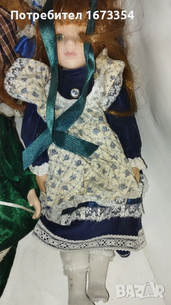 Втора двойка кукли(снимка номер 7 ( седем) две кукли със синя рокля и кафяво яке и кафява карирана пола размер 40 см( не можах да намеря маркировка )