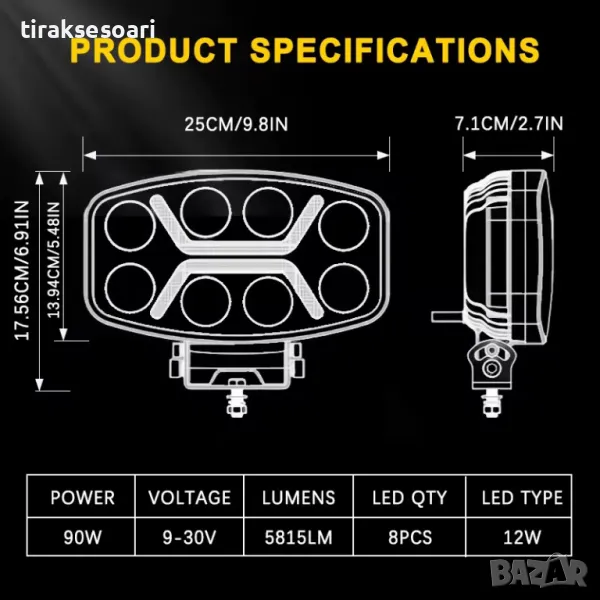 LED мощен диоден фар халоген лампа 12V-24V 180W бяло-жълто за АТВ джип камион трактор земеделски и селскостопански машини и др.