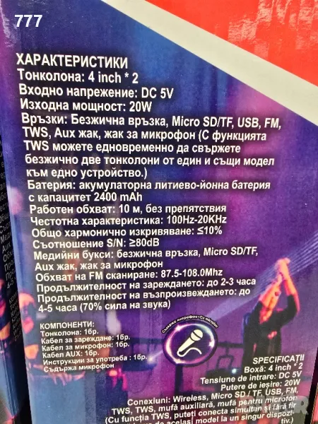 BLUETOOTH TОНКОЛОНА - 20 W С МИКРОФОН И "RGB" СВЕТЛИНИ СВЪРЗВА СЕ С USB, TF, FM, И BLUETOOTH. СЪВМЕСТИМО С MP3. GSM РАБОТЕН РЕЖИМ: 4-5 ЧАСА , ТАБЛЕТ, КОМПЮТЪР. И ОБХВАТ ДО 10 M.