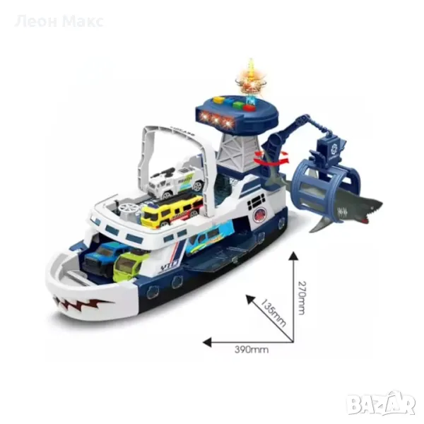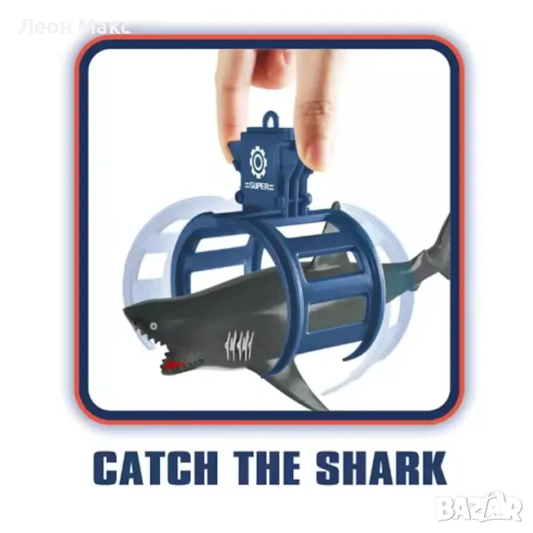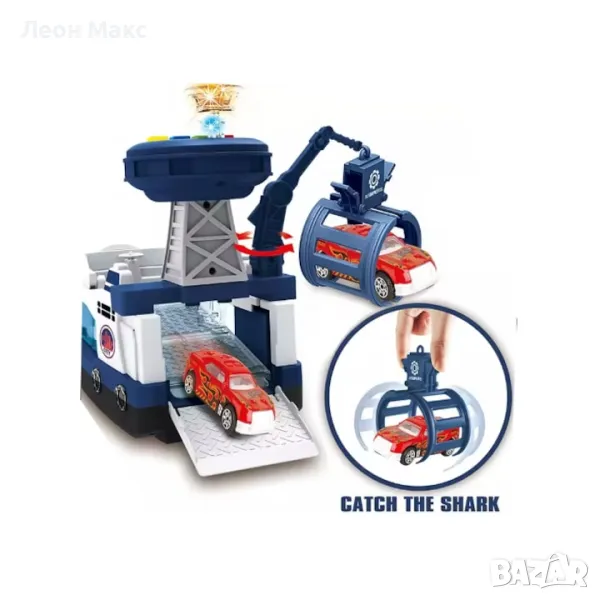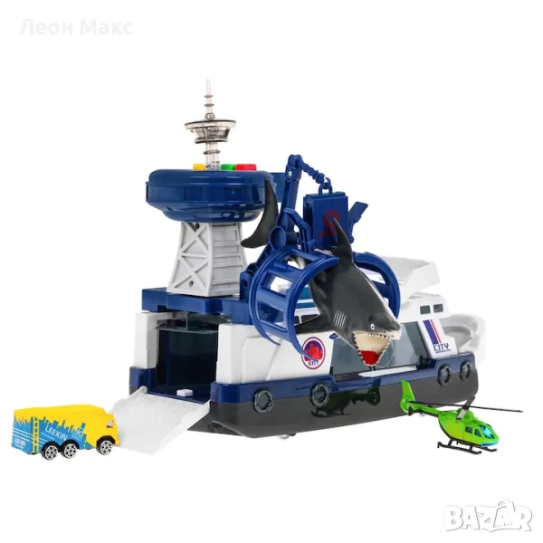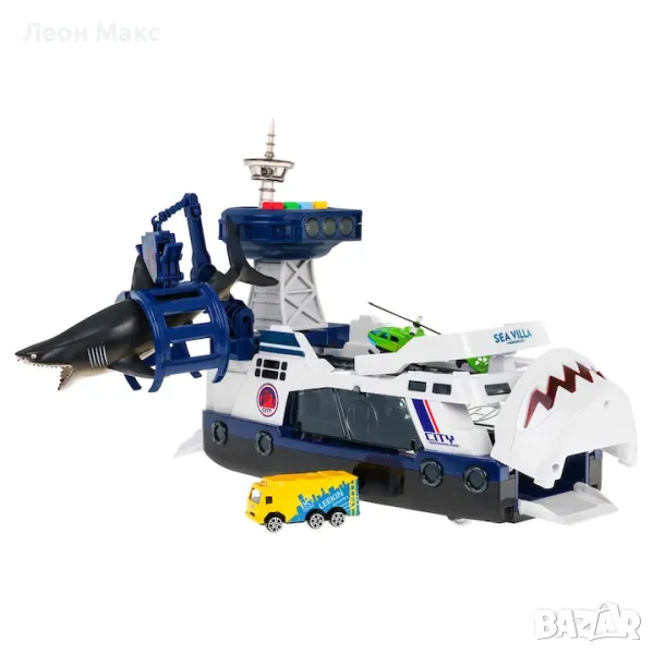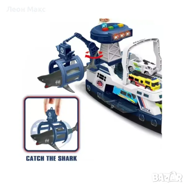 Лодка за риболов с акула, оборудвана със звукови и светлинни функции е предложение за деца от 3 години. Лодката е с две палуби, като на долната отзад и отпред е закрепена плъзгачка за пружини.