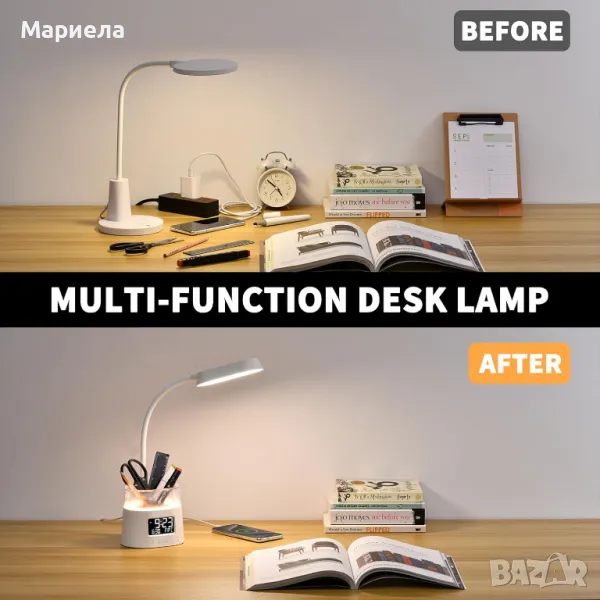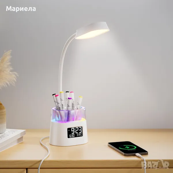 LED настолна лампа с държач за писалка и USB порт / RGB светлина / Светещ Часовник