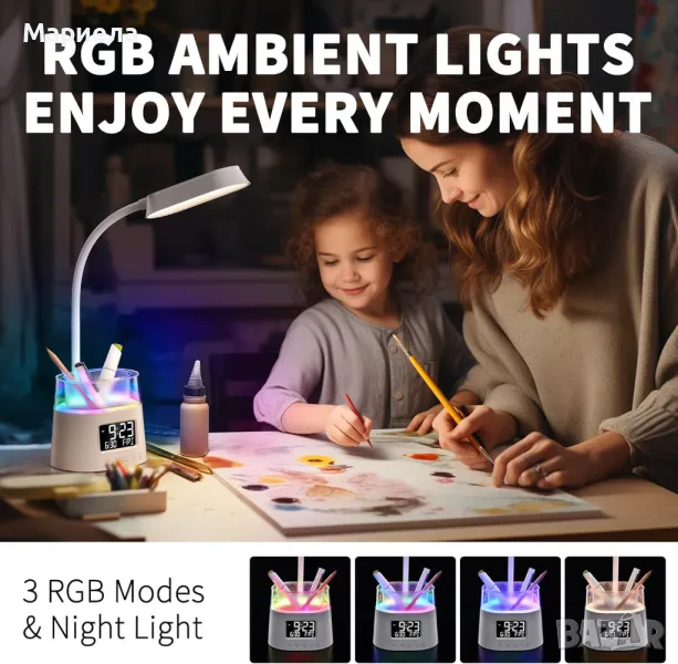 Тази настолна лампа има държач за писалка, който осигурява стилно и удобно решение за съхранение на химикалки и други дребни предмети, за да спестите място на бюрото си, докато 3 режима на RGB светлини създават спокойна и романтична атмосфера за вас.