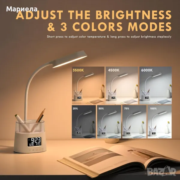 С тази настолна лампа можете да избирате между топла бяла, студена бяла и естествена бяла светлина и лесно да регулирате яркостта, за да отговори на нуждите от осветление на различни сцени, само чрез продължително натискане на бутона за превключване, това е страхотна настолна лампа за четене, учене, работа, сън и т.н.;