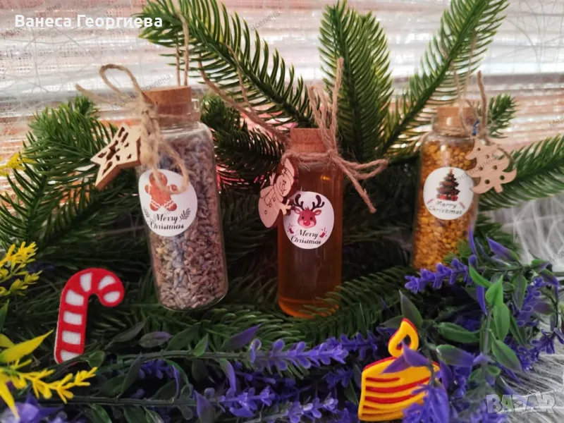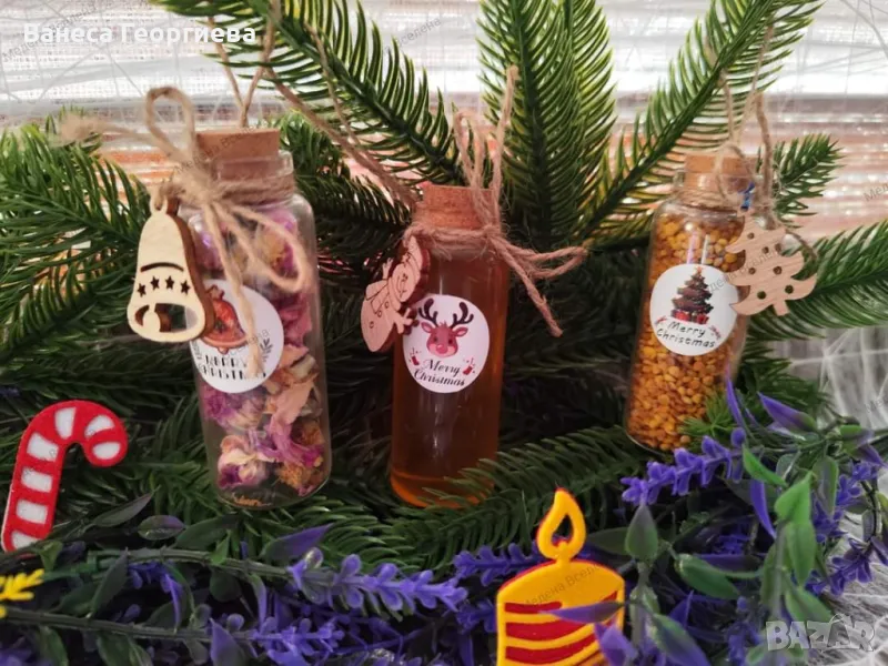 Това са различните коледни играчки - със смисъл и грижа за здравето!Украсете Вашата елха със здраве и красота!Представяме Ви два уникални комплекта под формата на шишенца, които съчетават красотата на празника с грижата за здравето:Комплект 1: Пчелен мед, пчелен прашец и цвят от роза Дамасцена.Комплект 2: Пчелен мед, пчелен прашец и цвят от лавандула.Ръчно декорирани с любов и внимание към детайла!Тези коледни съкровища не само ще украсят Вашето коледно дърво, но и ще създадат уютно настроение в дома Ви. След празника те могат да се използват за приготвяне на ароматен и полезен чай. Подсладете го с натурален пчелен мед, добавете пчелен прашец за подсилване на имунната система и се насладете на уюта на Коледа с чаша топлина и здраве.Перфектен подарък за Вашите близки или за самите Вас – красива и смислена украса, която носи полза дори след празника.За поръчки и информация се свържете се с нас на ЛС. Комплект 1- пчелен мед букет 55гр.пчелен прашец 25 гр.сух цвят роза Дамасцена