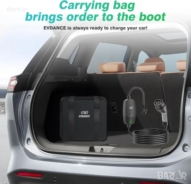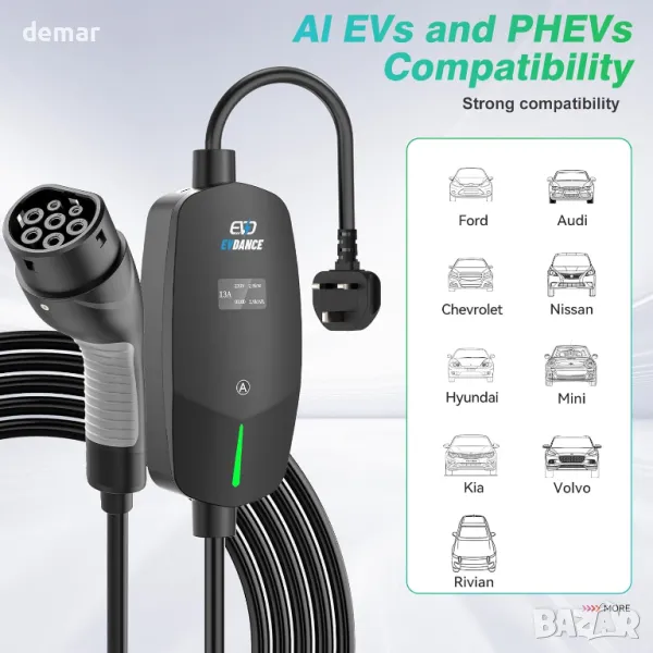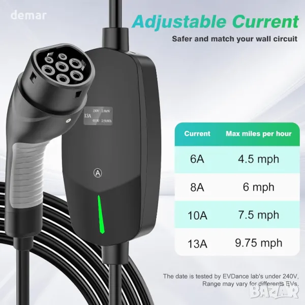 EVDANCE EV зарядно тип 2, 8 метра, 6/8/10/13A, регулируем ток, IP66