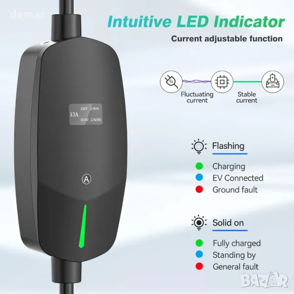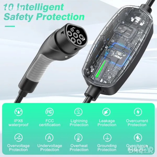 Това зарядно устройство Mode 2 EV разполага с регулируем ампераж (6A/8A/10A/13A) с вход 200-240V, като дава приоритет на безопасността, като препоръчва по-ниски токове за нощна употреба. Неговият 8-метров кабел тип 2 осигурява удобно зареждане и преносимост, подходящ за ежедневна употреба или пътуване. Зарядното е снабдено с 1,3-инчов OLED екран за ясен дисплей, поставен в издръжлив корпус от ABS, издържащ големи натоварвания и продължителна употреба. Съвместим с повечето електромобили в Обединеното кралство/ЕС, той включва функции за безопасност като автоматично изключване при необичайни токове или високи температури, възобновяване само когато условията се нормализират.