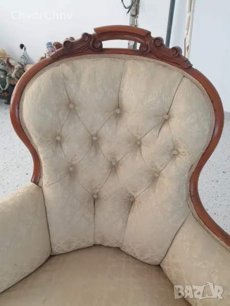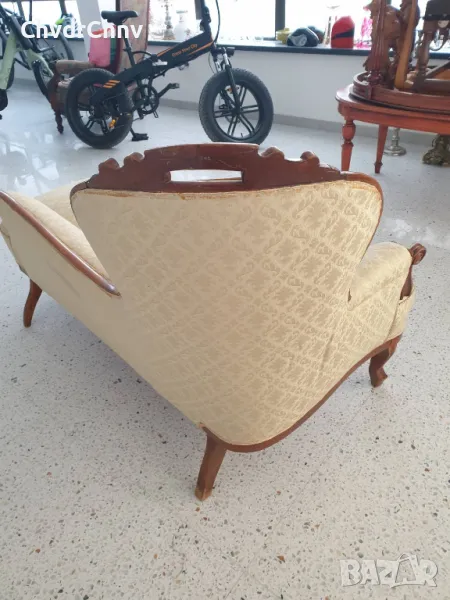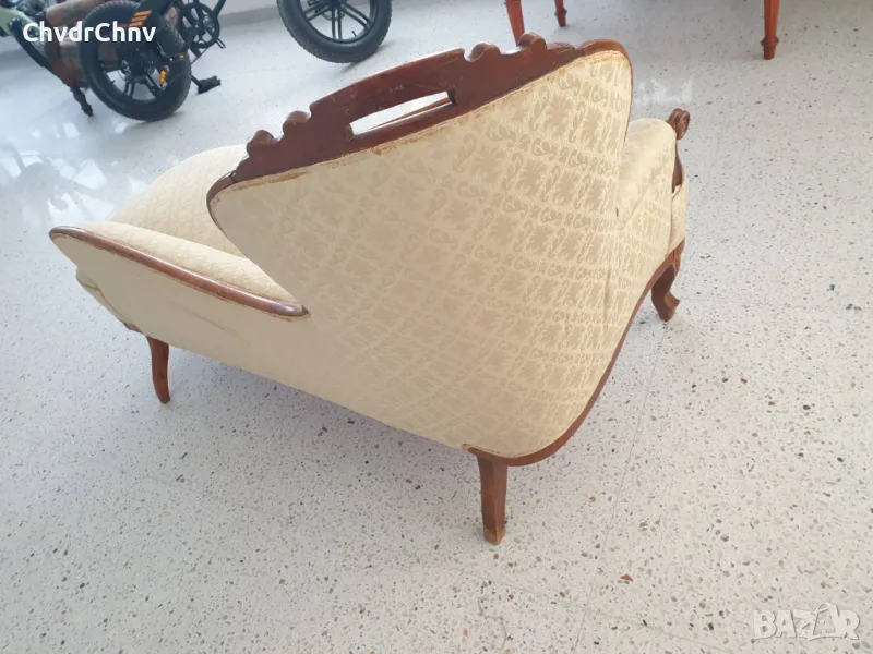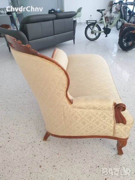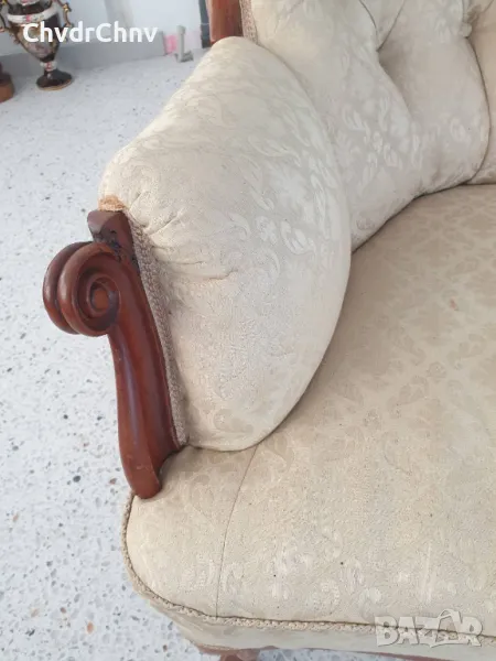 Диванът е много запазен (внос от Швеция), здрава дамаска, дървени декорации и крака (от махагоново дърво), без протрито/скъсано (аз не съм го ползвал), здрави шевове, удобен, мек, ефектен, в стил барок.