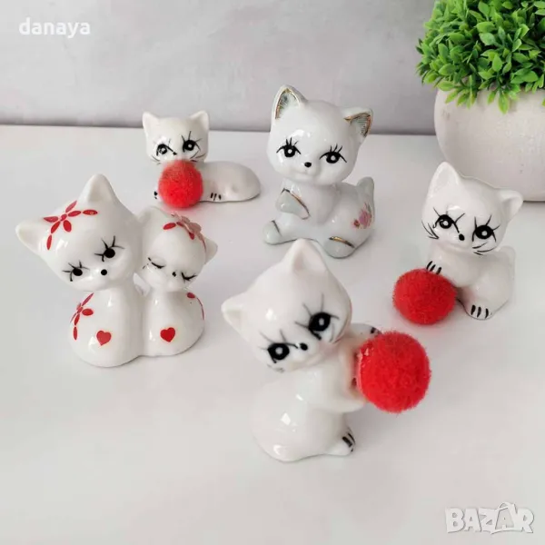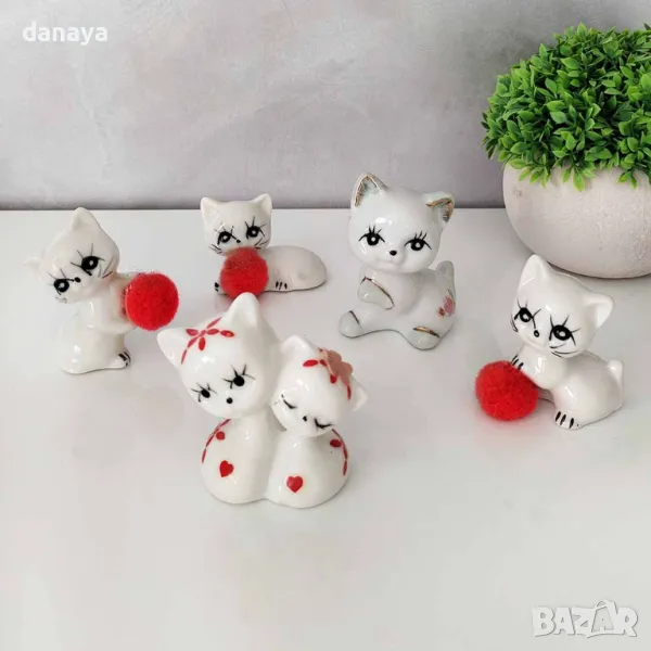 Ретро фигури котета. Комплект от 5 мини керамични фигурки „Бели котета“ – идеалният акцент за вашия дом или подарък за любител на котките! Тези ретро фигурки са уникални със своето излъчване, изобразявайки сладки бели котета с червени топки и детайлна окраска. Размерът на най-голямото коте е 7×5 см, което ги прави подходящи както за декорация на рафт, така и за тематични колекции.