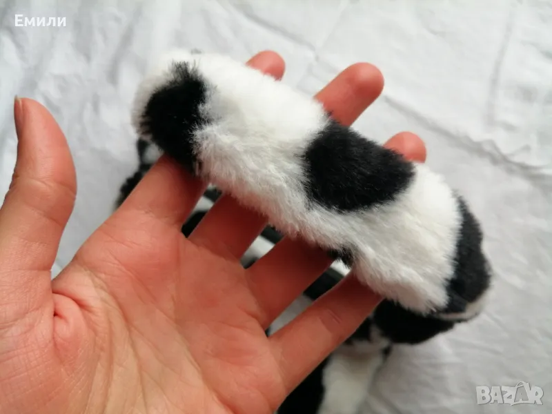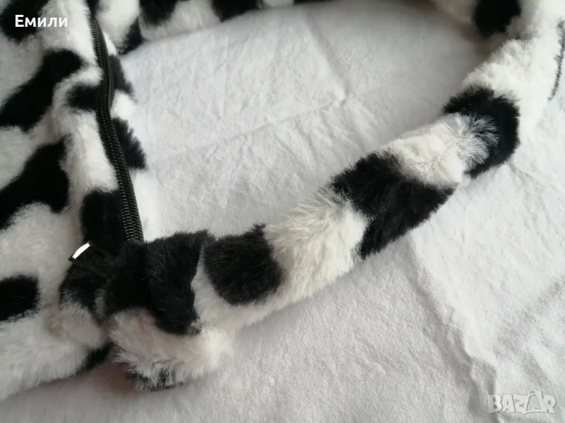 Мека, плюшена чанта за рамо с принт кравичка в черен и бял цвят