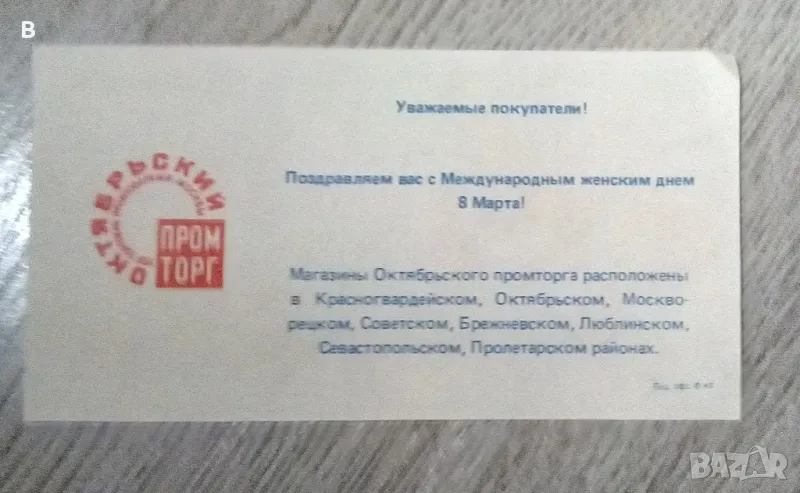 "Октомврийски" Промторг магазини от социализма поздравителни карти за 8 март. Налични 8 броя.