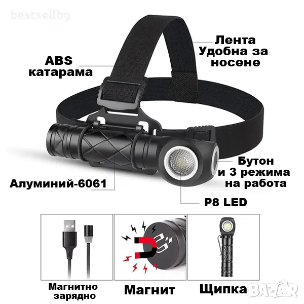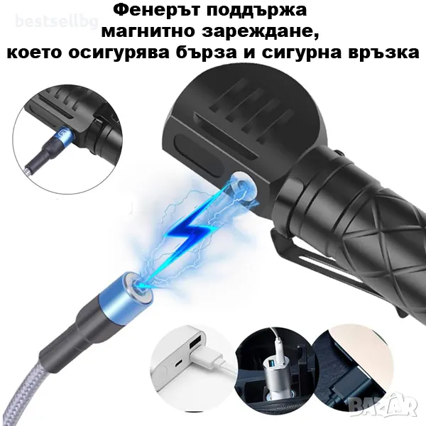 Този многофункционален фенер с магнитно зареждане е идеалният спътник за всеки, който се нуждае от мощна и надеждна светлина. С него можете лесно да го превърнете в челник или работна лампа, благодарение на включените аксесоари.
