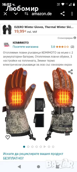 Отопляеми ловни ръкавици KEMIMOTO за мъже с 2 акумулаторни батерии