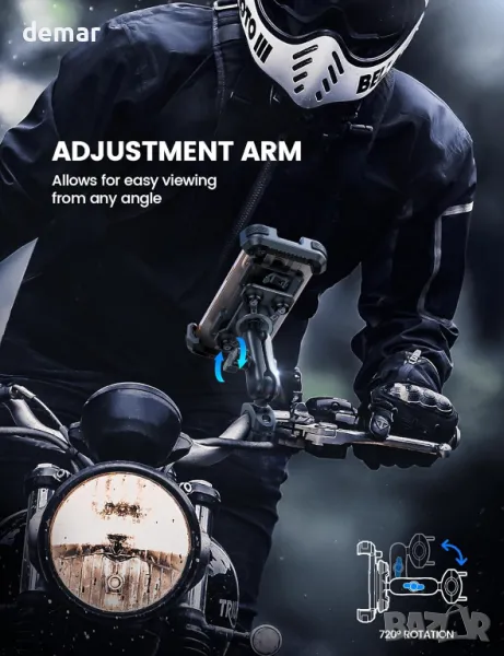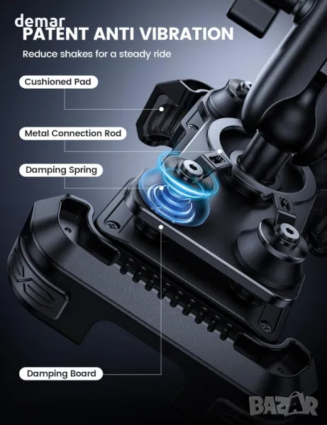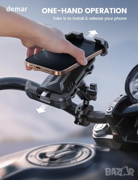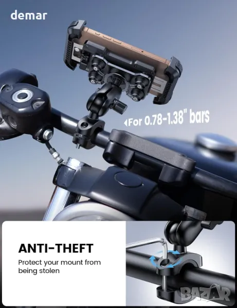 Стойката за телефон Lamicall 2024 за мотоциклет разполага с въртяща се на 360° глава с двойна топка и метално удължително рамо за гъвкави настройки и сигурно позициониране. Патентованият му двоен дизайн против удар съчетава амортисьор със силиконови въздушни възглавници, за да минимизира вибрациите, предпазвайки вашия телефон и камера. Стойката включва U-образна тръбна винтова скоба с функция против кражба и предпазна ключалка за осигуряване на стабилност дори при неравномерно каране. Работата с една ръка с автоматично прибиране на две рамена осигурява здрав захват и удължена издръжливост. Покрит с EVA силикон, той предлага цялостна защита срещу надраскване и плъзгане. Съвместим с 4,7-6,7 инчови устройства, той пасва на различни модели, като гарантира, че телефонът ви остава здраво закрепен по време на каране. Подходяща за кормило с диаметър 20-35 мм.