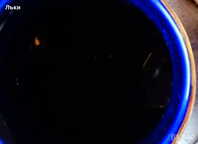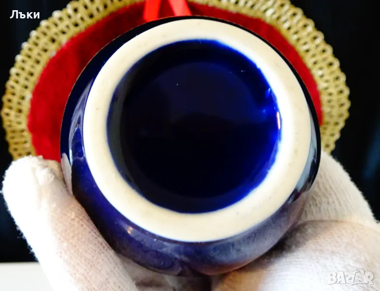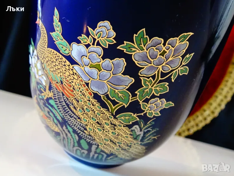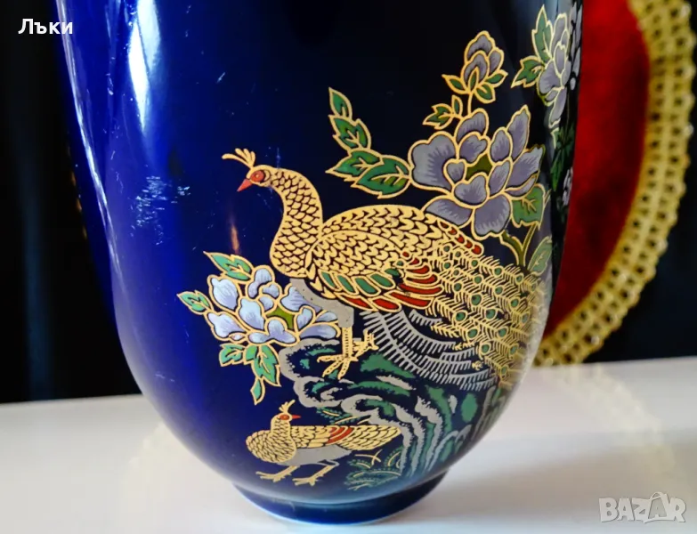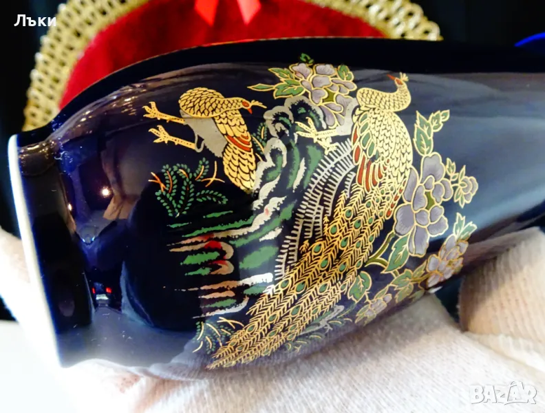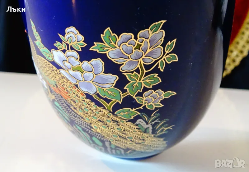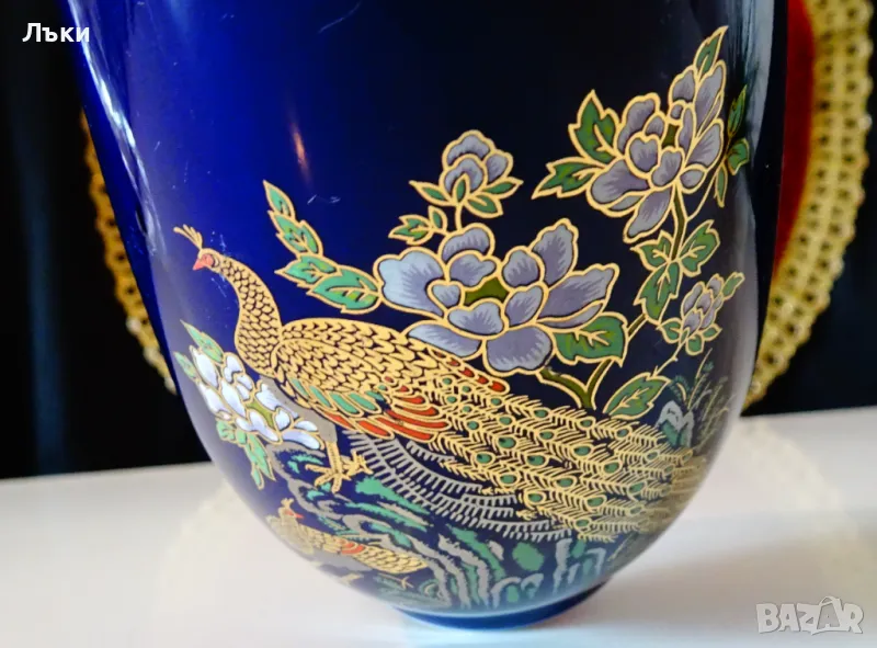 пауни сред разцъфнали цветя на мастилено син кобалтов фон.Изключително прецизен рисунък с 24 карата злато.Вазата не е маркирана,защото се е продавала с етикет и е била предназначена за японския пазар.Височина 15.5 см.,диаметър 8
