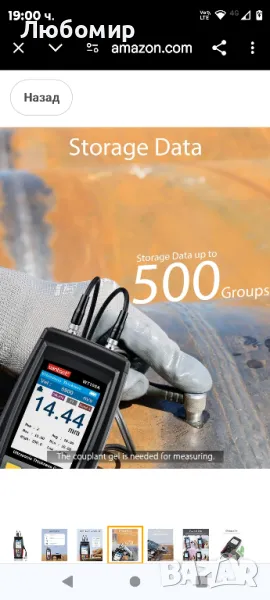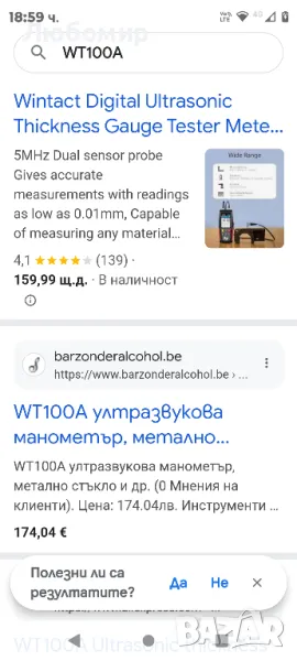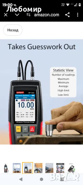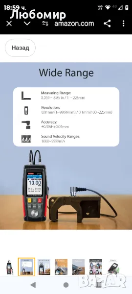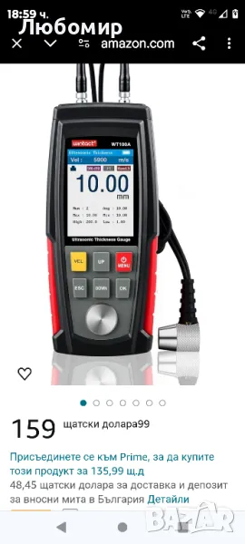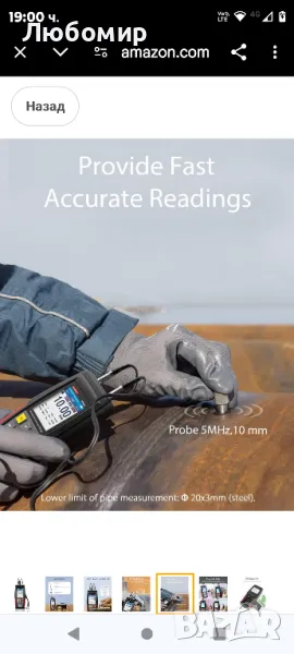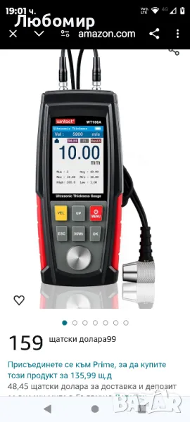 Цифров ултразвуков дебеломер Wintact, обхват от 0,039 до 8,85 инча със сонда за измерване на метални и неметални материали, стомана, сребро, пластмаса, стъкло, PVC, тръби.Бърз и точен: Ултразвуковият дебеломер варира от 0,039 до 8,85 инча/1 до 225 mm, Разделителна способност: 0,001 mm. Можете да получите точни показания (±0,5% H+0,002 in) в инчове или mm в рамките на 0,5 секунди.Регулируема скорост на звука: Можете лесно да промените скоростта на звука от 1000 на 1000m/s, за да получите най-точните резултати. Непрекъснато показва/актуализира средната, минималната/максималната стойност и броя на показанията по време на измерване и може също да зададе аларма за висока/ниска граница на дебелината.Многофункционален: 2,4-инчов HD цветен екран със задно осветяване и цветен дисплей с 5 избираеми единици, съхранение до 500 данни, статистически изглед, калибриране, функция за автоматично изключване и възстановяване на фабричните настройки.Разнообразни приложения: Широко използван за измерване на метални и неметални материали, стомана, алуминий, мед, месинг, цинк, пластмаса, PVC, стъкло, керамика, тръби и всеки друг добър проводник на ултразвукова вълна, стига да има успоредни горна и долна част повърхности.Какво получавате: 1 цифров ултразвуков дебеломер, 1 5MHz сонда, вграден метален калибриращ блок, 1 USB кабел, 3 акумулаторни батерии, 1 ръководство за работа.