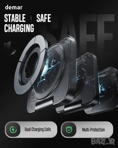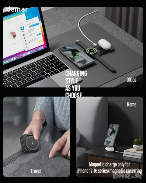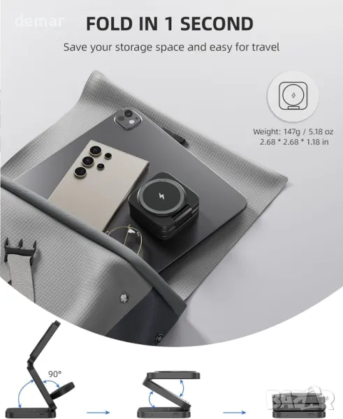 Тази компактна безжична станция за зареждане 3 в 1 е предназначена за устройства на Samsung, като позволява едновременно зареждане на вашия телефон, Galaxy Watch и Galaxy Buds. Неговият сгъваем дизайн поддържа хоризонтално и вертикално зареждане, като поддържа бюрото ви подредено и пътува безпроблемно. Съвместим с различни модели на Samsung и избрани серии iPhone, той разполага с три режима на зареждане, усъвършенствани магнити за прецизно подравняване и интелигентни защити за безопасност. Включеният 20W адаптер осигурява бързо и стабилно зареждане, което го прави удобно решение "всичко в едно" за вашите устройства. (Забележка: Не е съвместим с Apple Watch; необходим е магнитен пръстен или калъф за телефони Samsung).