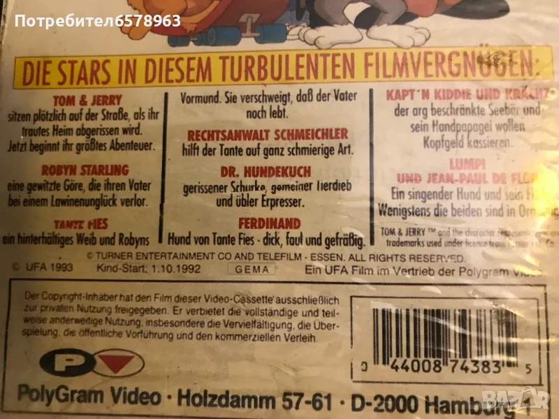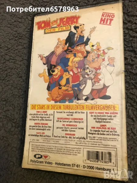 Продавам видеокасета първият филм на '' Том и Джери '' Касетата е на 32 години , озвучена на български език с времетраене около 1 час и 25 минути . Година 1992 г. Работи отлично . Изпращам с Еконт или Спиди .