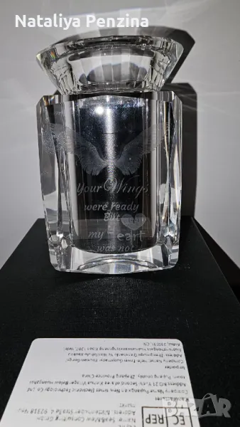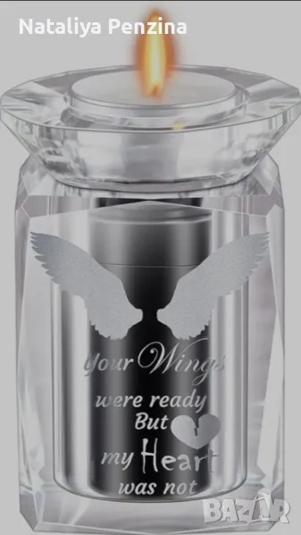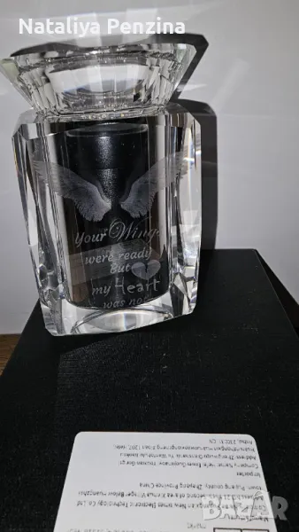 Уникален дизайн: думи с 2 ангелски крила „твоите крила бяха готови, но моето сърце не беше“, цялото е проектирано като свещник от кристална урна. Персонализирана мини урна: снимката със специфичен размер на любим човек може да бъде поставена в урната от вас самите. Цялата част е направена от висококачествен кристал, долната част е кух кристален блок, горният горен капак е проектиран като свещник за чаена свещ (свещта не е включена) Запазете ценен спомен.