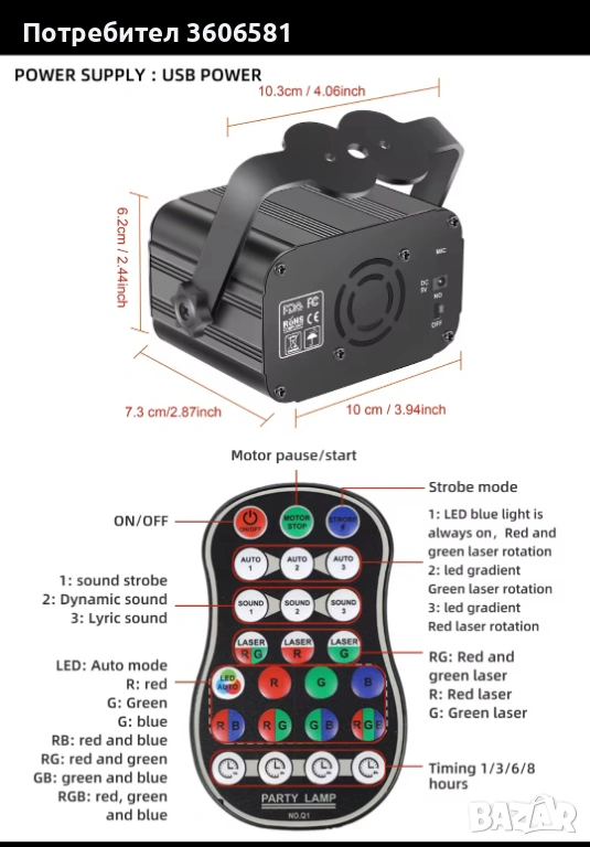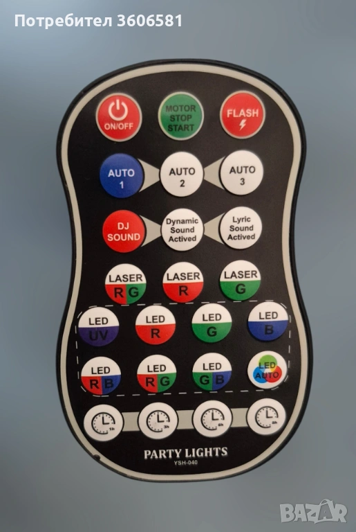 Инфрачервено дистанционно управление има, превключвател за осветлението, преобразуване на режима, превключвател за време, удобно и бързо. Дистанционно управление с режим за микрофона които реагира в такт с музиката.
