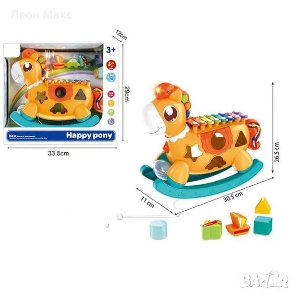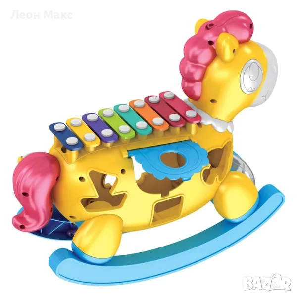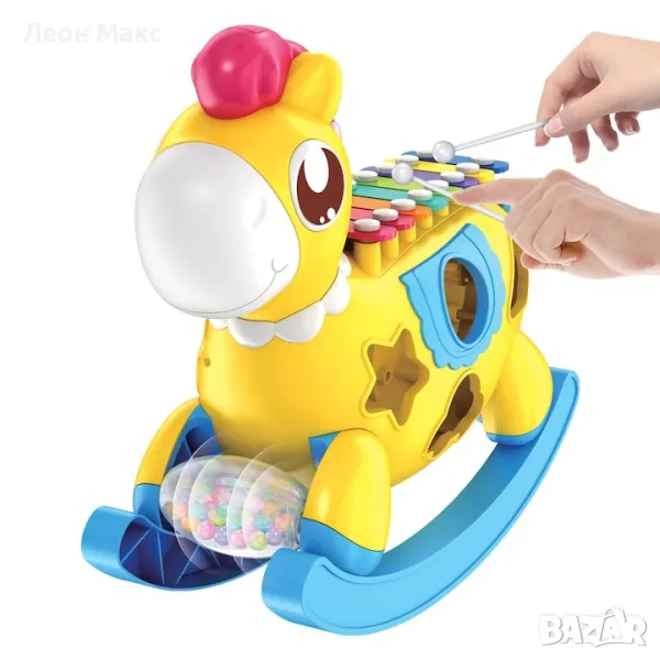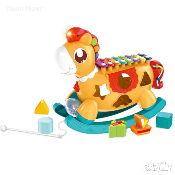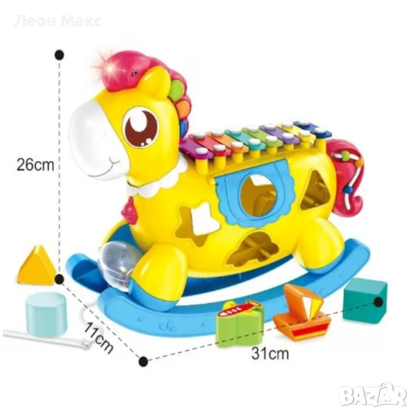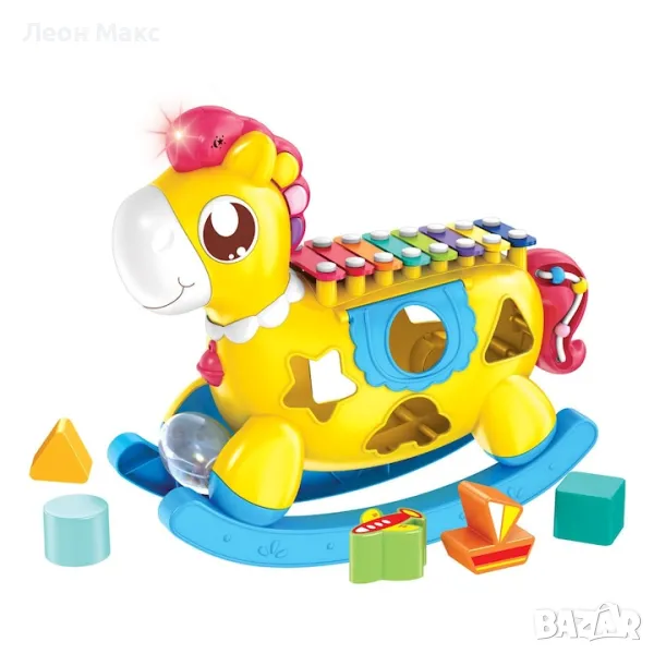 Закрепва се за играчката с връв, за да не я загуби детето. Освен това има 3 книги с 6 песни, които да научите да свирите. Тялото на коня ще служи като сортировач.