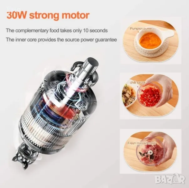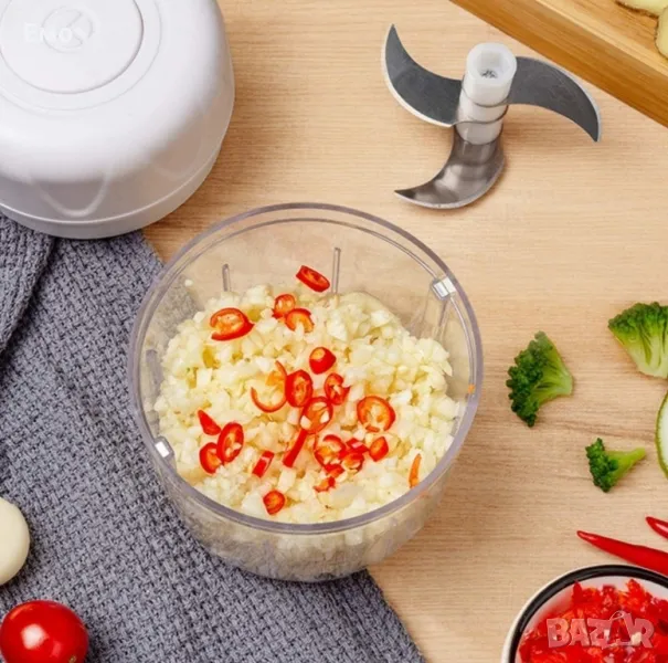 Мини електрически чопър с три остриета в розов цвят, идеален за бързо и лесно нарязване на зеленчуци, плодове, ядки и други съставки.