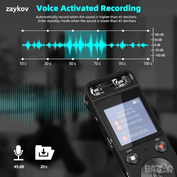 диктофон: Изберете гласово активиран режим (AVR). В зависимост от вашите настройки, той автоматично ще записва или ще постави на пауза и ще се рестартира след прекъсване. Ултратънкият, тънък и компактен дизайн с 0,7 инча се побира във всяка малка чанта или чанта. От съображения за сигурност можете да зададете своя собствена парола, за да защитите вашите файлове.