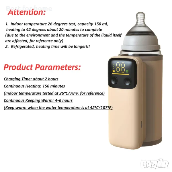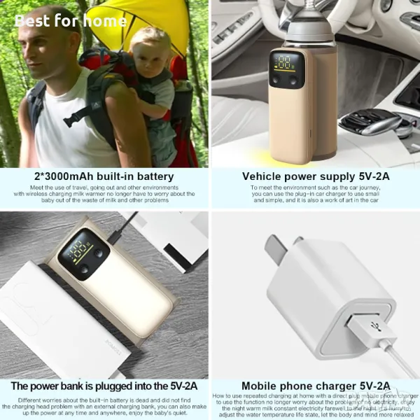 Преносими нагреватели за бутилки за пътуване: нагревателят за мляко се адаптира към изходна мощност от 7,4 V за 18 W. Този преносим нагревател за бутилки е изработен от PU материал. Нашият нагревател за бебешки шишета използва 18 W адаптер за бързо зареждане за постигане на бързо нагряване като бутилка