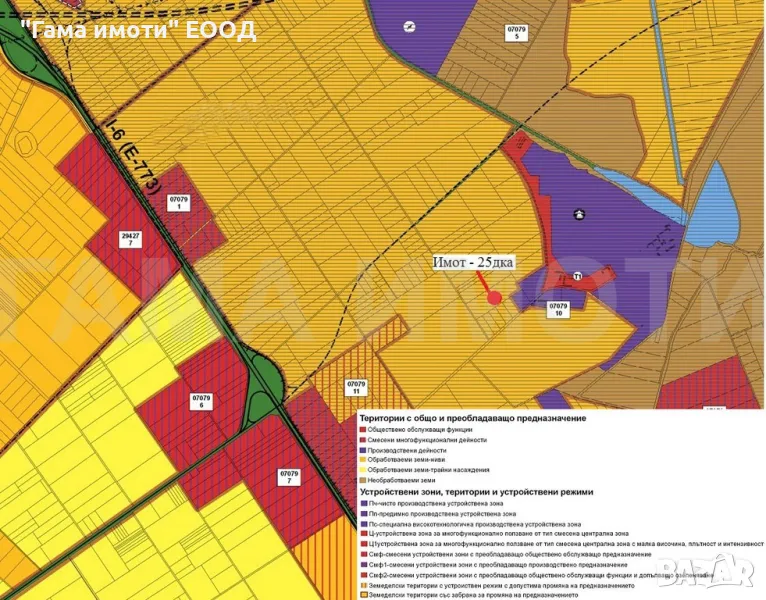 Поземлен имот с площ от 24995 кв.м. и 92 метра лице на второстепенен път, на километър след „Чикън груп“, в местност „Веригите“ (Синджирли герен), гр. Бургас. Дълбочината на имота е 270 метра. Парцелът е равен и е с правоъгълна форма. Имотът е със статут на земеделска земя, но попада в зона с допустима промяна на предназначението и е в съседство със зона за промишлени дейности. Комуникациите са в непосредствена близост до парцела.