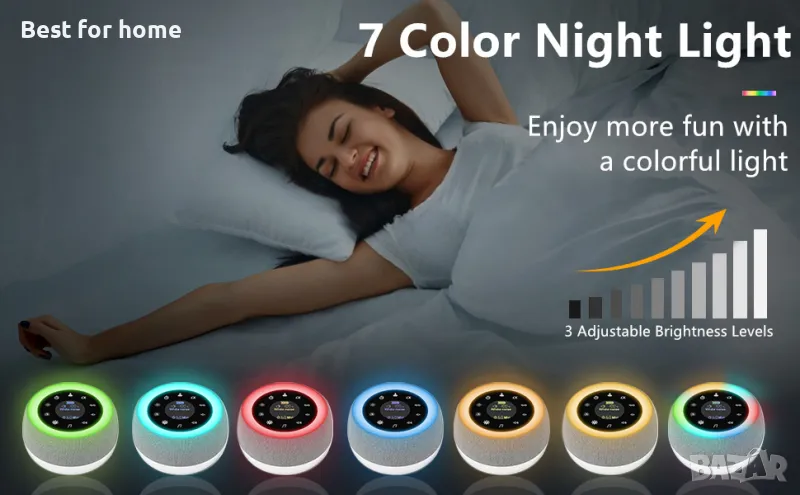 Повечето машини за сън имат само звуци. Освен звуците разполагаме и с нощна лампа със 7 цвята. Ярката нощна светлина улеснява вашето нощно кърмене. Ние също използваме нощна светлина като дишаща светлина, която да ви насочва да дишате заедно с ритъма на пулсиращата светлина, като ви помага да се успокоите и да заспите.