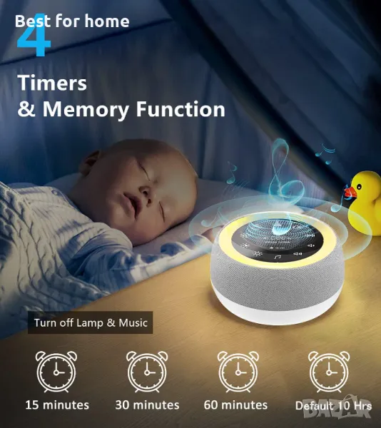 Звуковата машина за сън може да се възпроизвежда непрекъснато по подразбиране за 10 часа или 15/30/60 минути таймер за автоматично изключване. Можете да настроите таймера, преди да си легнете, не е необходимо да ставате, за да изключите звуковите машини.