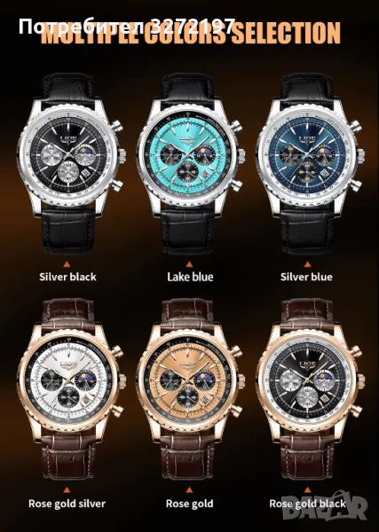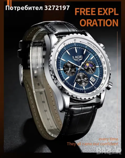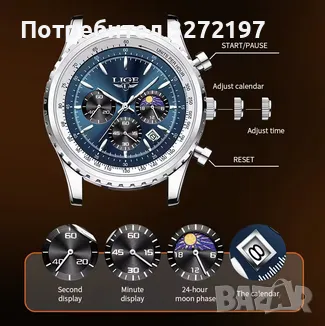 LIGE- кварцов часовник, механизъм Япония,водоустойчив,календар,хронограф