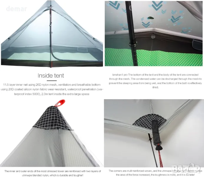 Компактна и лека, тази 690-грамова палатка за открито е с размери 230 x 125 cm в разгънато състояние и се сгъва до 34 x 15 cm за съхранение. Проектиран с издръжливи материали, включително двустранен външен слой със силиконово покритие и водоустойчиво найлоново дъно, той осигурява отлична стабилност със своите стълбове от алуминиева сплав. Настройката е бърза и лесна, отнема по-малко от пет минути за един човек, с включени инструкции. Дишащата вътрешна марля предотвратява насекомите, като същевременно поддържа въздушния поток, а удобният вътрешен джоб предлага място за съхранение на най-важните неща. Издържа на силни ветрове и проливен дъжд, но е необходимо лепило за уплътняване на шевовете преди употреба при проливен дъжд. Палатката е преносима с чанта за носене и изисква трекинг щеки (не са включени) за сглобяване. Идеален за потребители с височина до 190 см, той осигурява комфорт и удобство при външни условия.