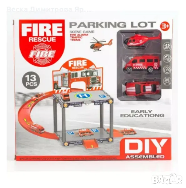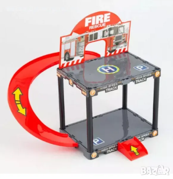 Този комплект за игра включва всичко необходимо за вълнуваща игра с тематика пожарна безопасност. Комплектът съдържа паркинг с много нива, две пожарни коли и въртолет, които могат да се използват за бързо реагиране при бедствия.