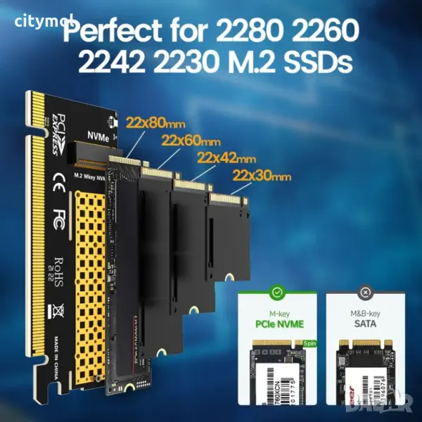 - Поддържа PCIe Gen4, PCIe Gen3, PCIe Gen2 и PCIe Gen1 M.2 NVMe 80 mm, 60 mm, 42 mm, 30 mm SSD. Поддържа само M.2 NVME SSD (M-Key), НЕ поддържа M.2 SATA SSD (ключ B). Работи по -добре с Windows 11/10 и също така е съвместим с Windows 7/8 (може да се наложи драйвер).