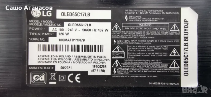 LG OLED65C17LB с счупена матрица ,EAX69061002(1.0) ,EAX69049007(1.0) ,6870C-0852B ,AC650AQL CNA1_MA