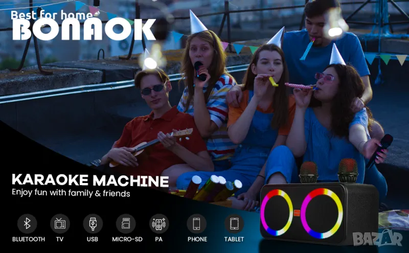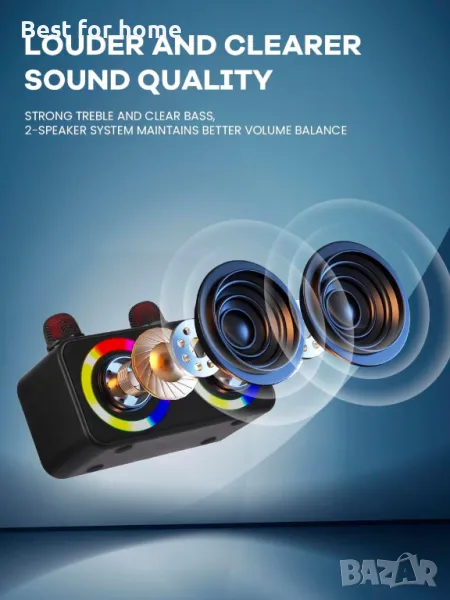 【2 микрофона】 Тази машина за караоке има два микрофона, което ви дава възможност да се забавлявате с приятелите си! Това е наистина забавен артикул, който събира семейството и приятелите за караоке вечери или за игра с модифицирани гласове. Този Bluetooth високоговорител ще даде на вашите приятели или семейство прекрасно пеене на партита на закрито или на открито!